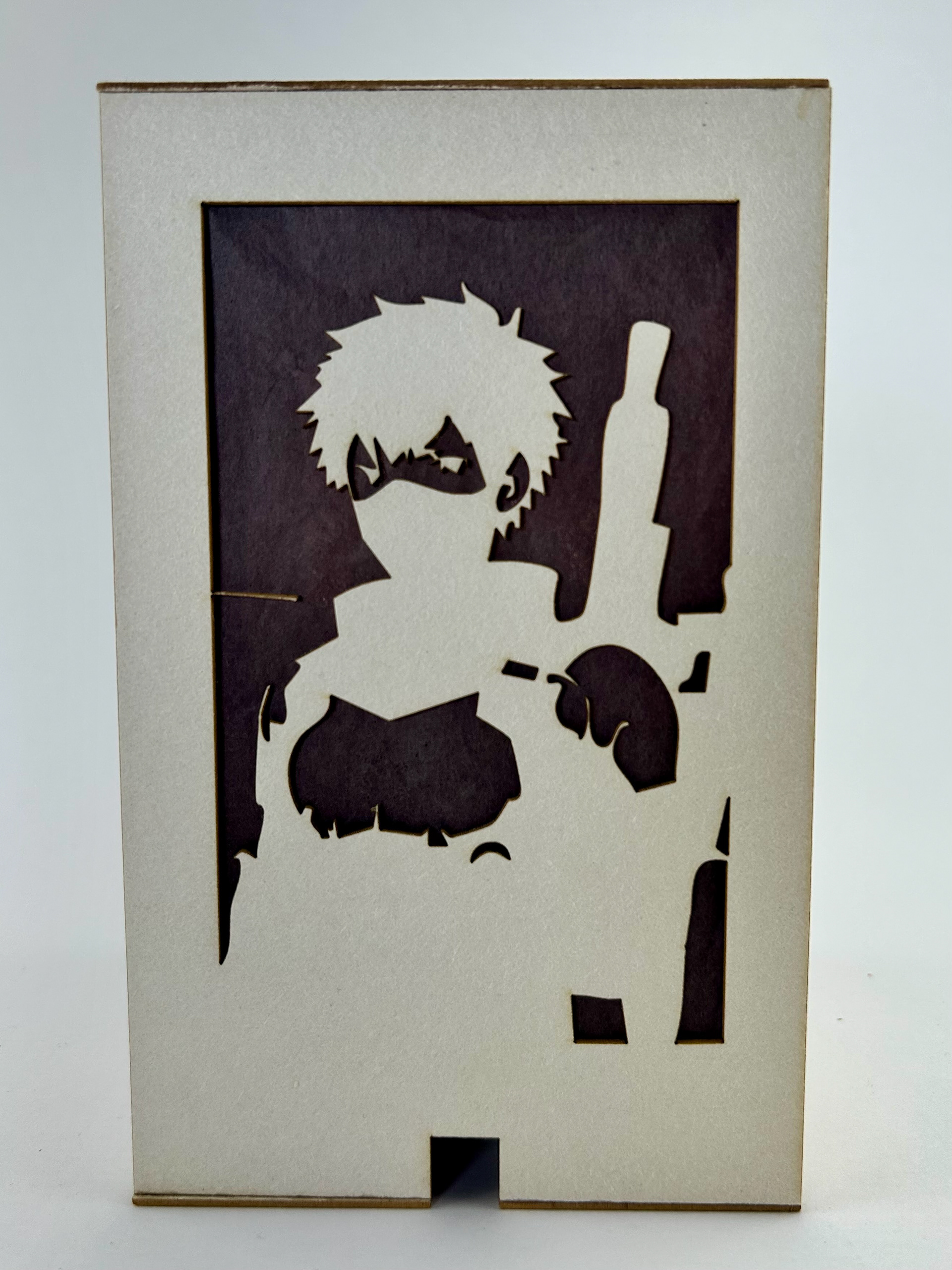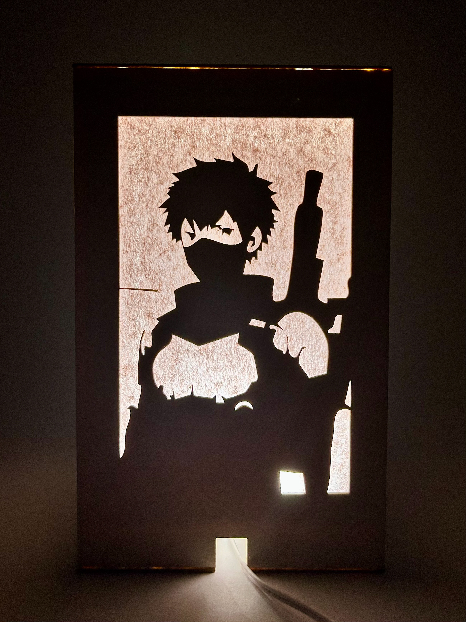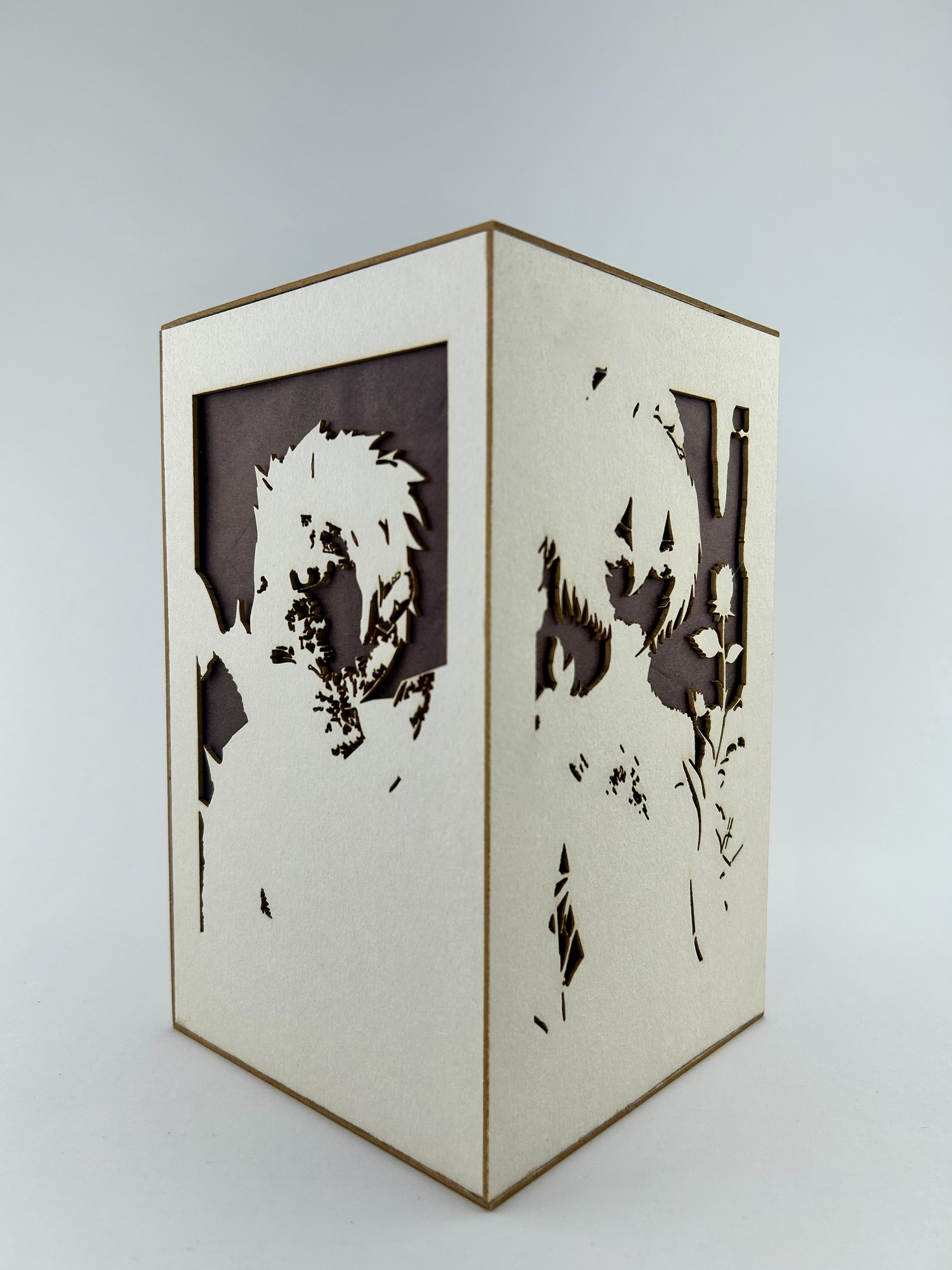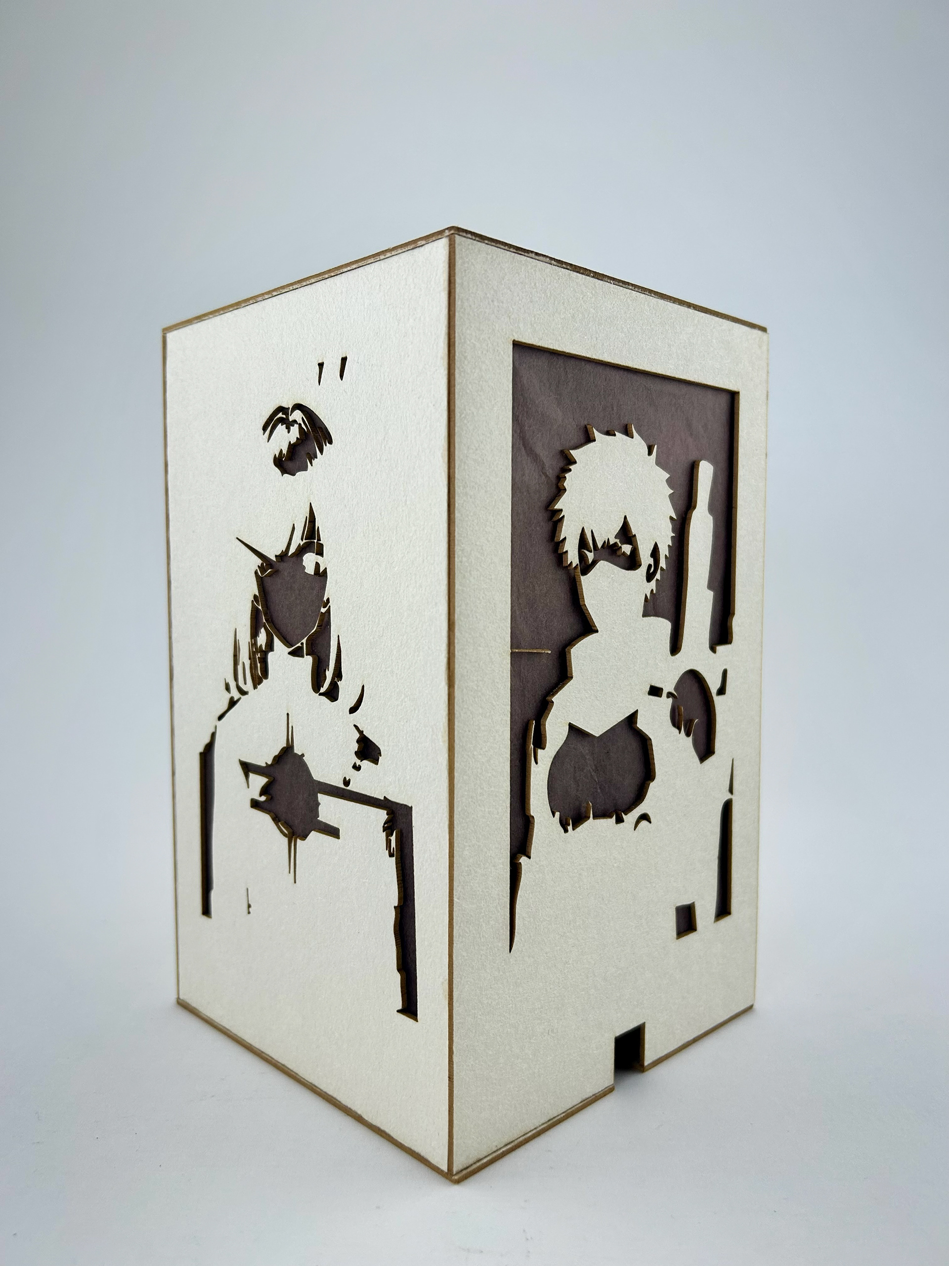 "This 3D lamp, crafted from taskboard and tissue, is inspired by my series Finalist Sentry and designed using Rhino 8. The design was programmed into a laser cutter to cut out intricate character silhouettes precisely, featuring Mieko, Blaze, Harumi, and one yet-to-be-named character. The top showcases the series title. After the designs were carefully cut, tissue was applied behind the cutouts to enhance transparency, allowing the light to create a striking brown hue that highlights the details. This project expanded my experience with Rhino 8, laser cutting, and working with new materials like taskboards and tissue to achieve a unique lighting effect."
