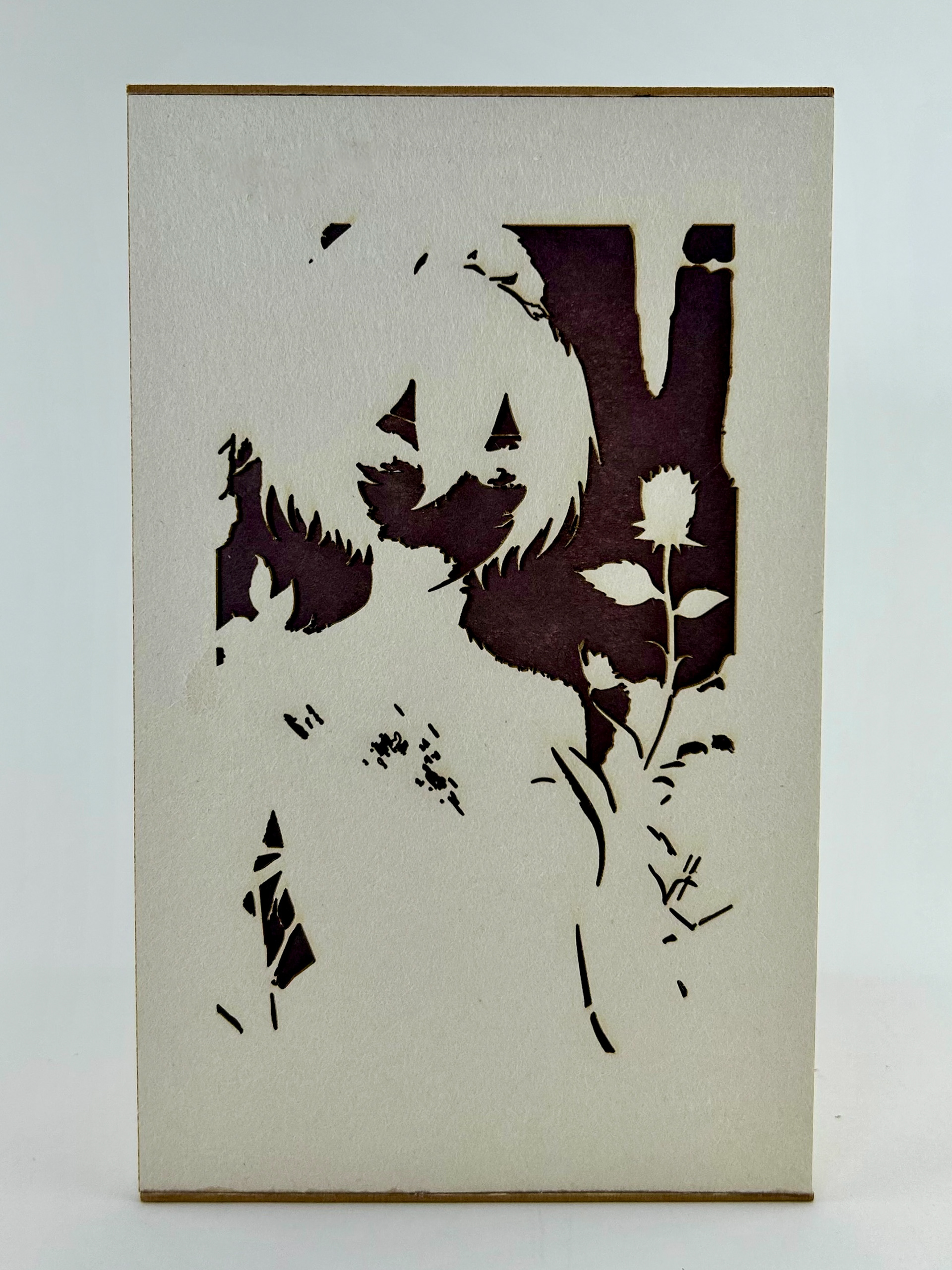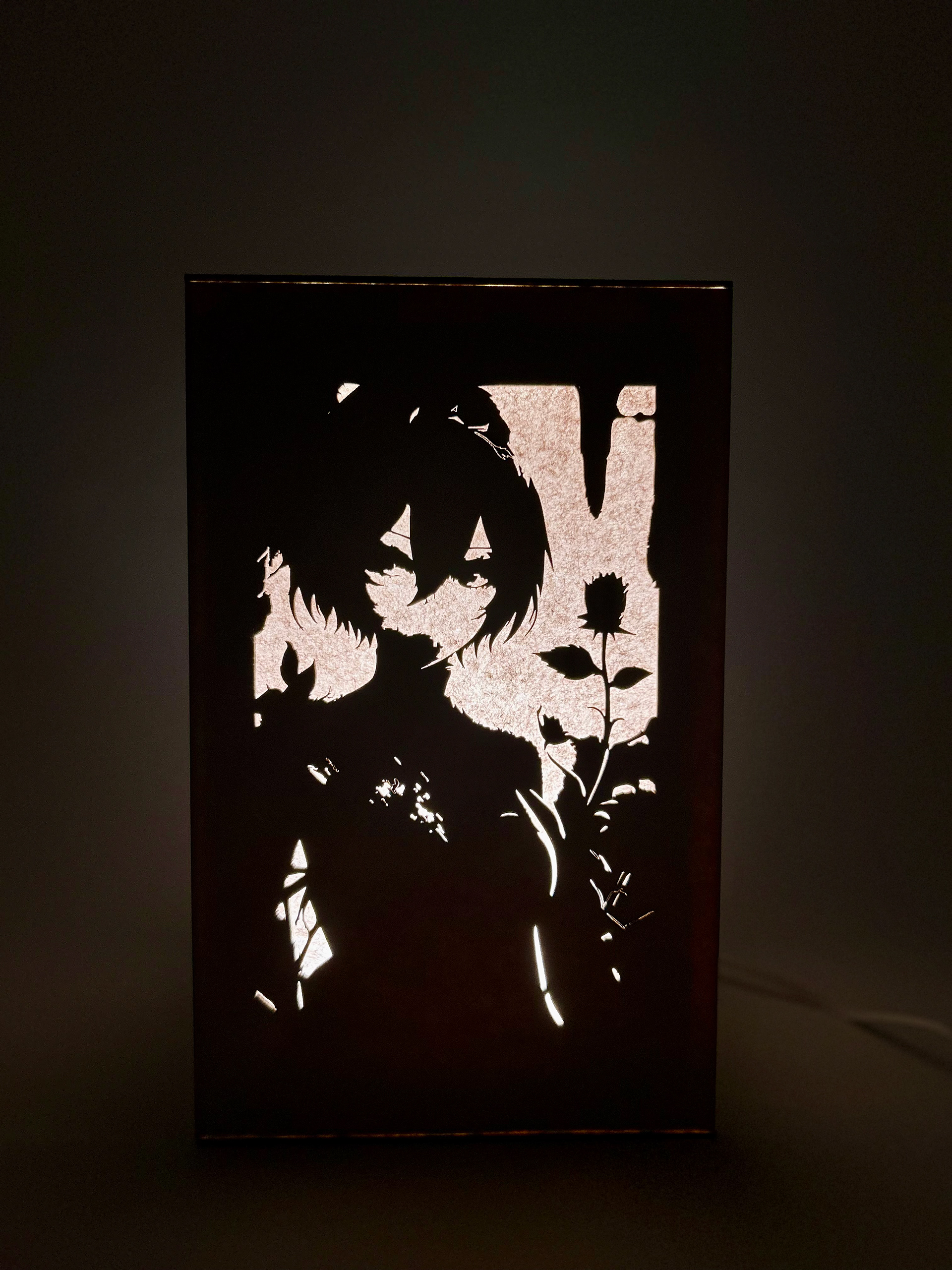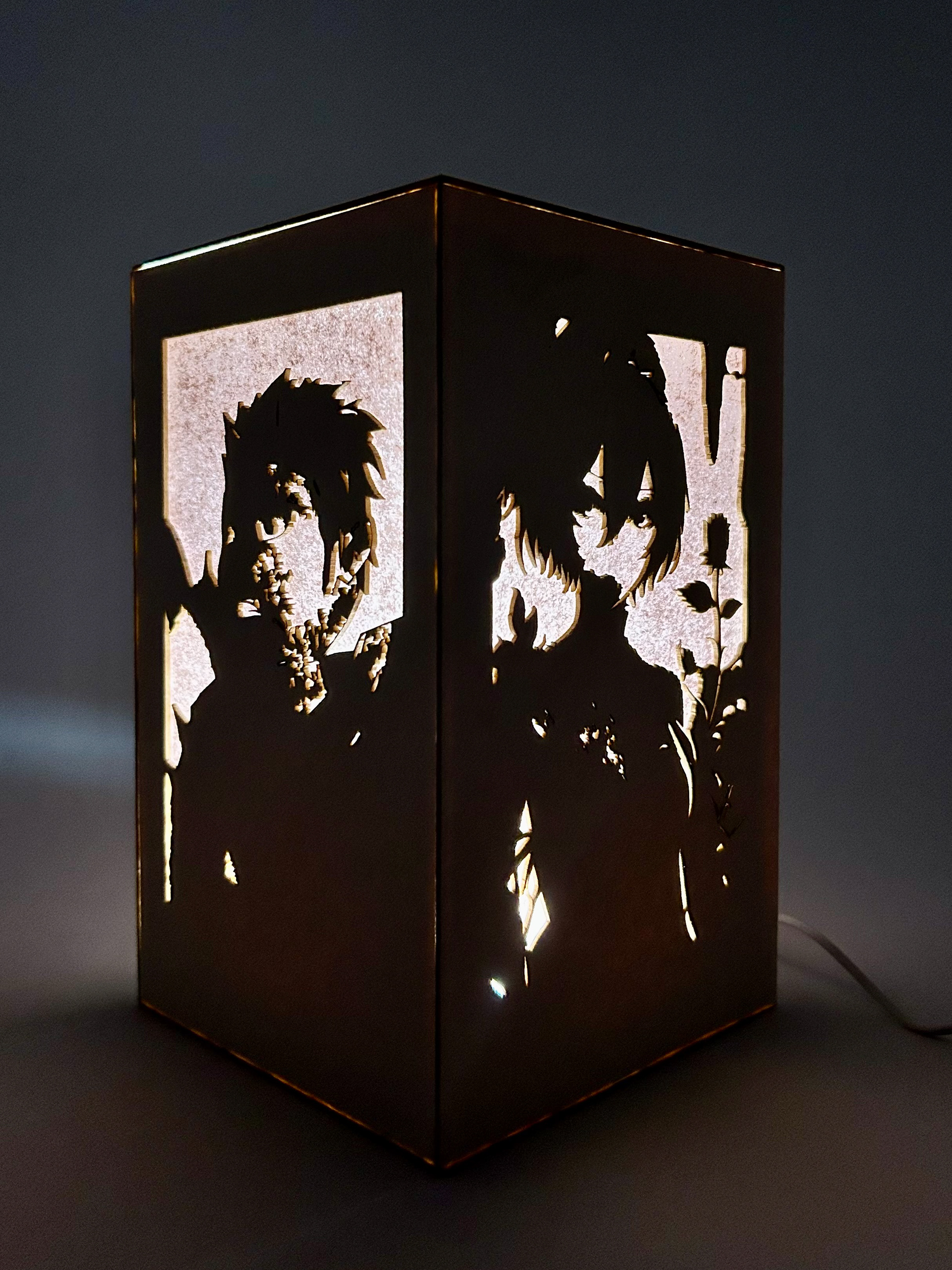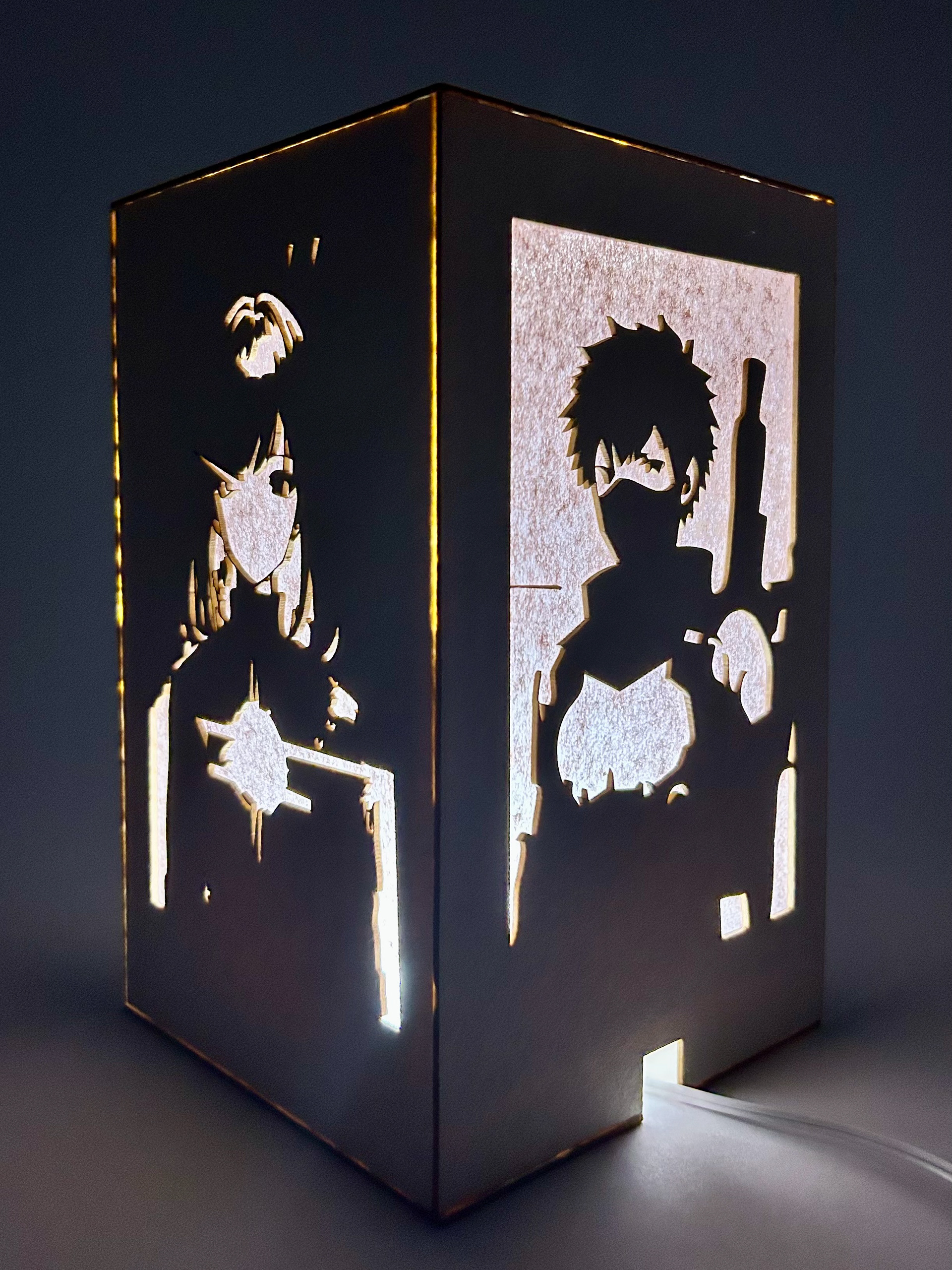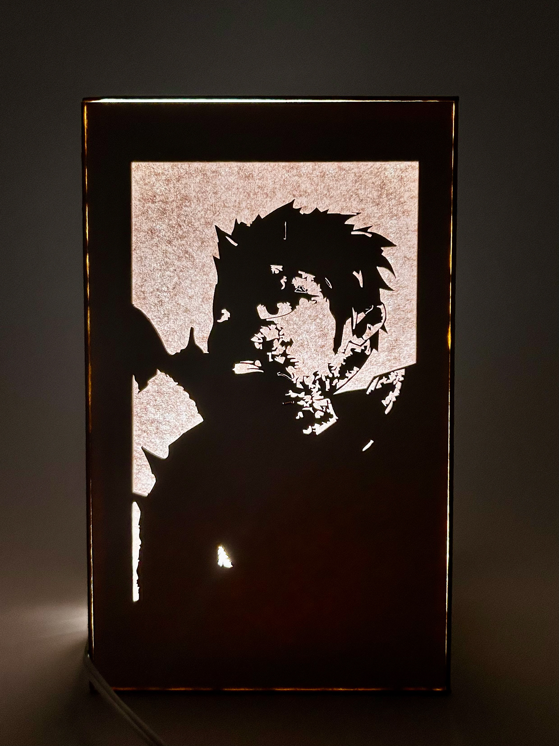 "This 3D lamp, crafted from taskboard and tissue, is inspired by my series Finalist Sentry and designed using Rhino 8. The design was programmed into a laser cutter to cut out intricate character silhouettes precisely, featuring Mieko, Blaze, Harumi, and one yet-to-be-named character. The top showcases the series title. After the designs were carefully cut, tissue was applied behind the cutouts to enhance transparency, allowing the light to create a striking brown hue that highlights the details. This project expanded my experience with Rhino 8, laser cutting, and working with new materials like taskboards and tissue to achieve a unique lighting effect."