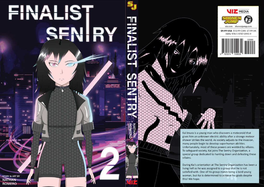 "Designed with Adobe Illustrator and Photoshop, this cover art for Finalist Sentry Volume 2 highlights the enigmatic presence of the series’ deuteragonist, Mieko Kishimara. She stands with a serious expression against a sprawling cityscape, her neon bo staff resting on her back, symbolizing her quiet strength. The back cover adopts a minimalistic approach, featuring Mieko in a defensive stance, gripping her staff in one hand. This restrained design choice enhances the mystery surrounding her character and the true extent of her abilities."